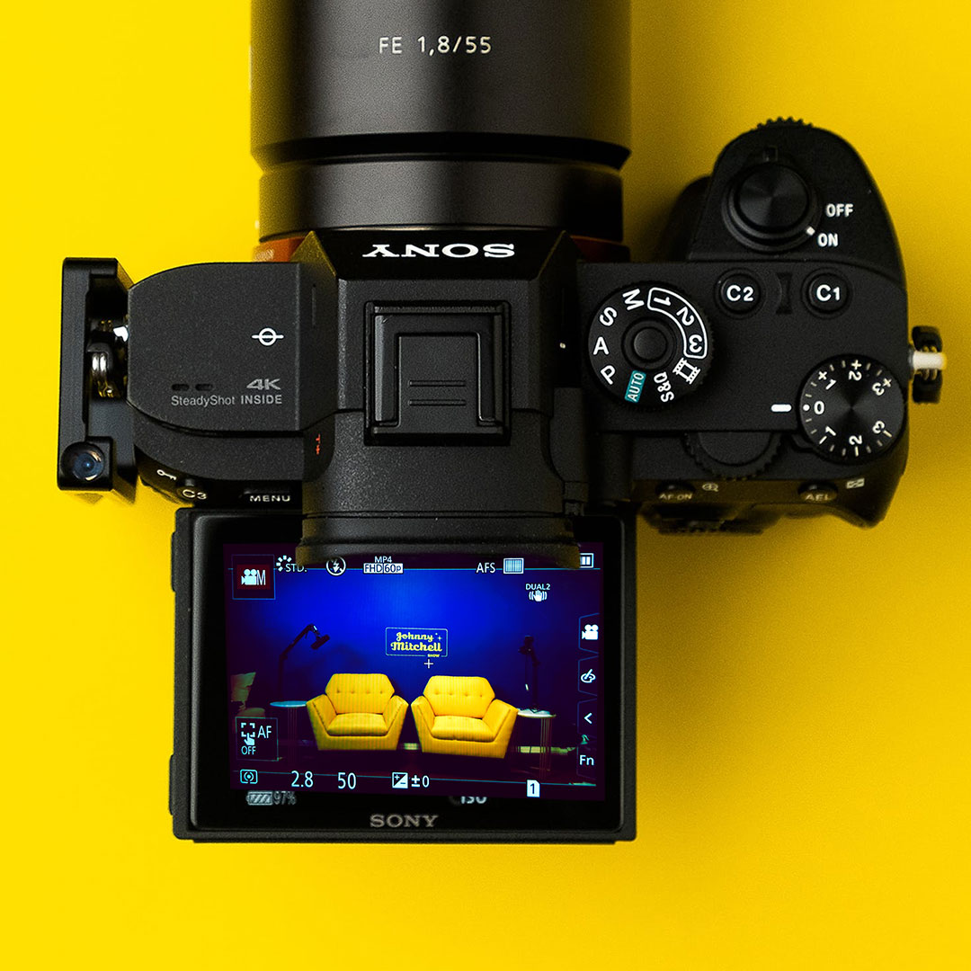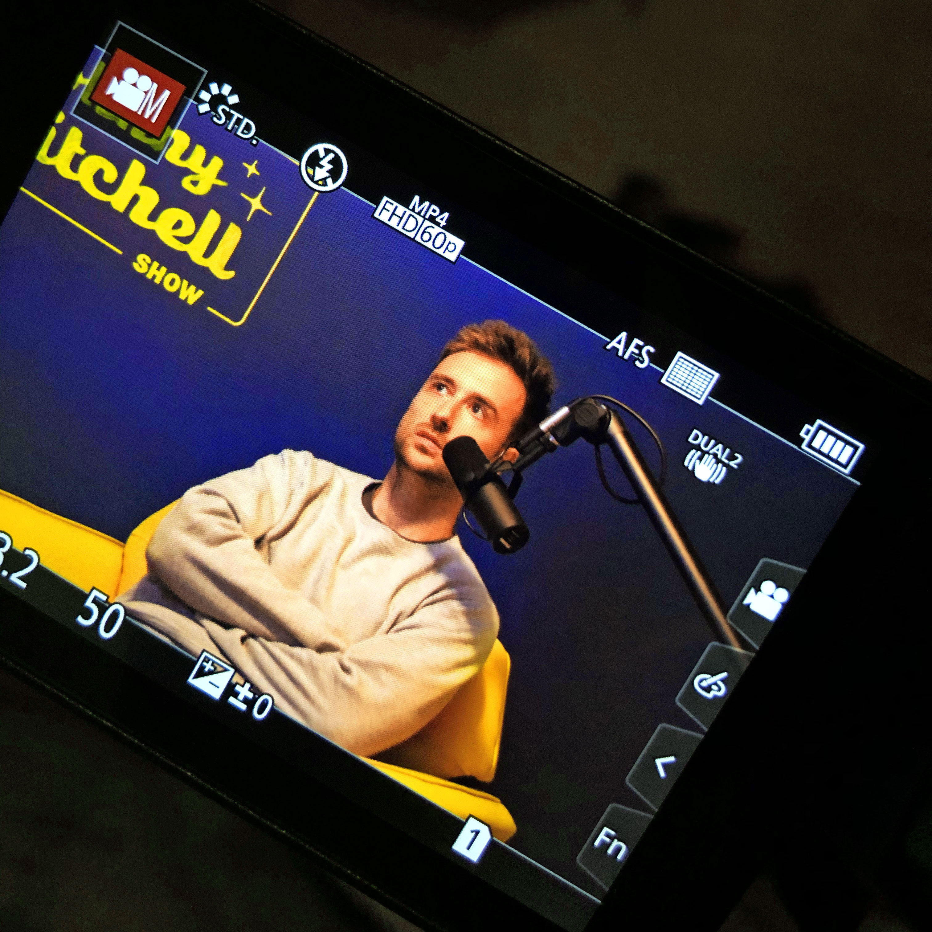 Due to limited space, the set required a highly efficient layout to support a three-camera studio setup. I designed and branded the show to evoke a modern interpretation of The Merv Griffin Show, hand-painting the logo and coordinating furniture and lighting to unify the environment.